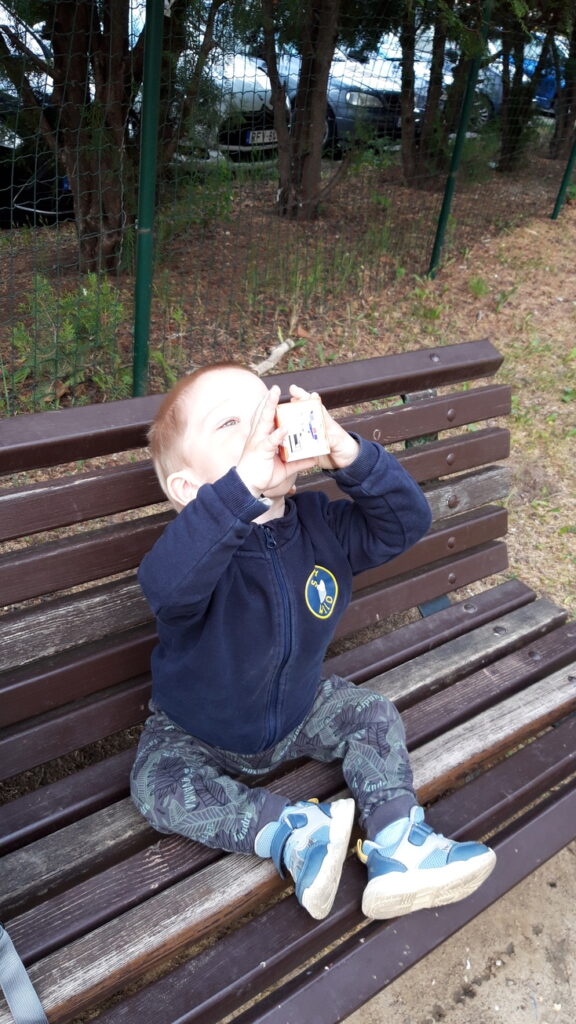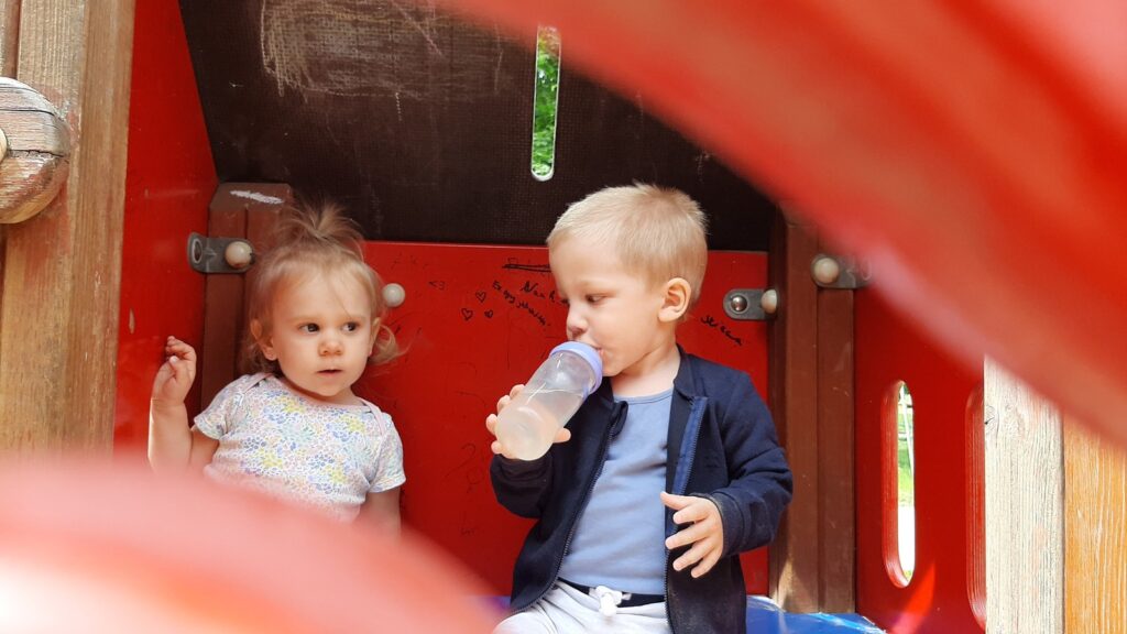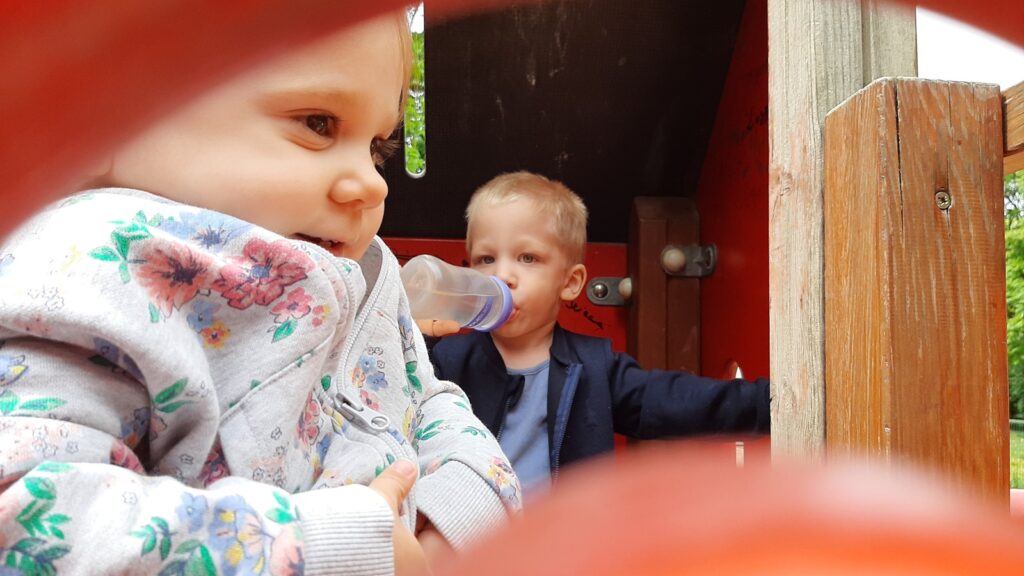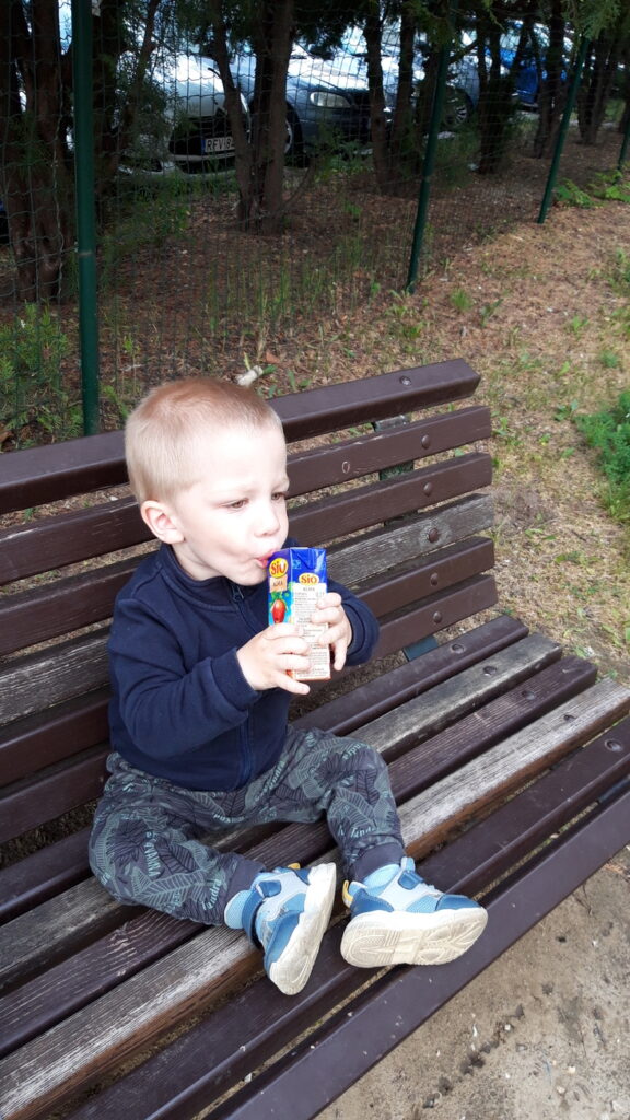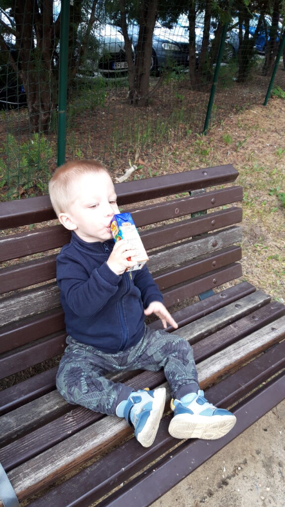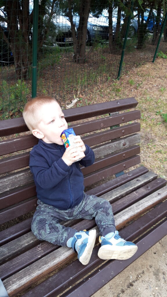 Délutáni alvás után roncsi haverommal bandáztunk a játszótéren, majd mikor szomjas lettem megoldotta az almalé ivást szívószál nélkül is.