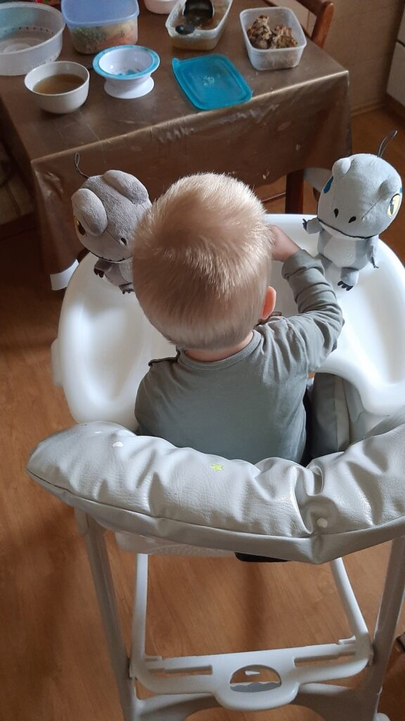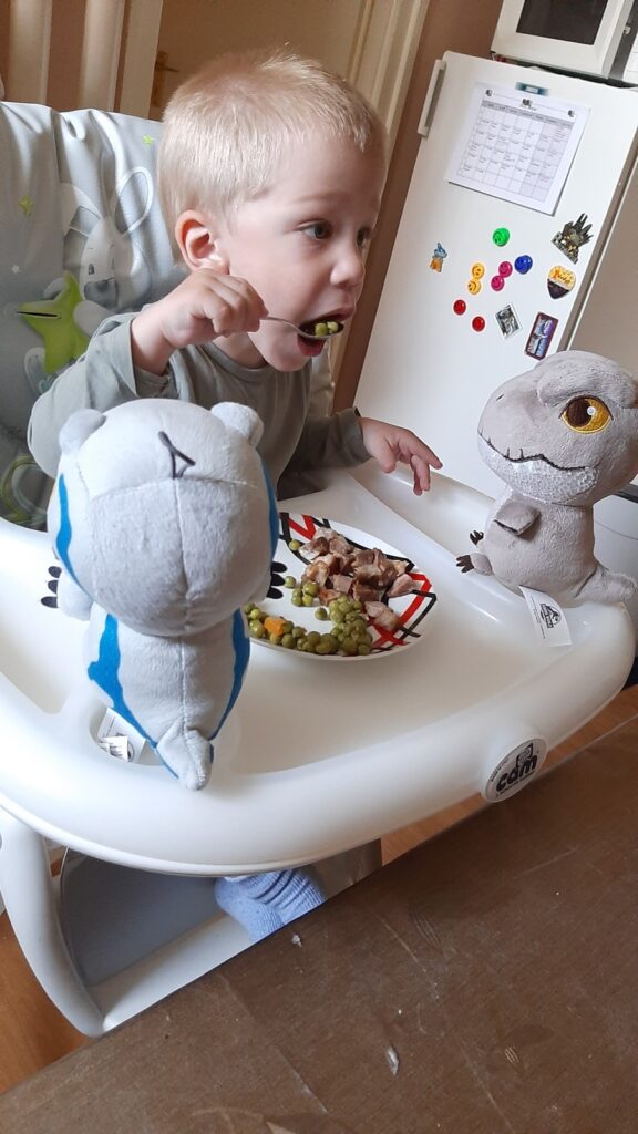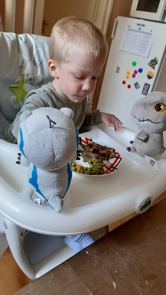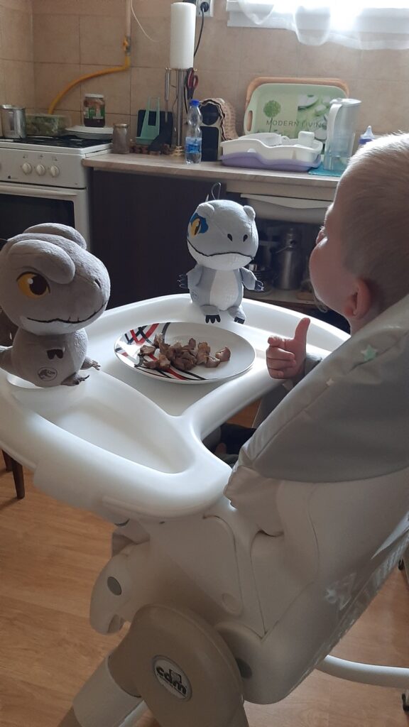 Kedden délelött segítettem Anyának ebédet készíteni, majd az elkészült ebédemet meg is osztottam a dinókkal.