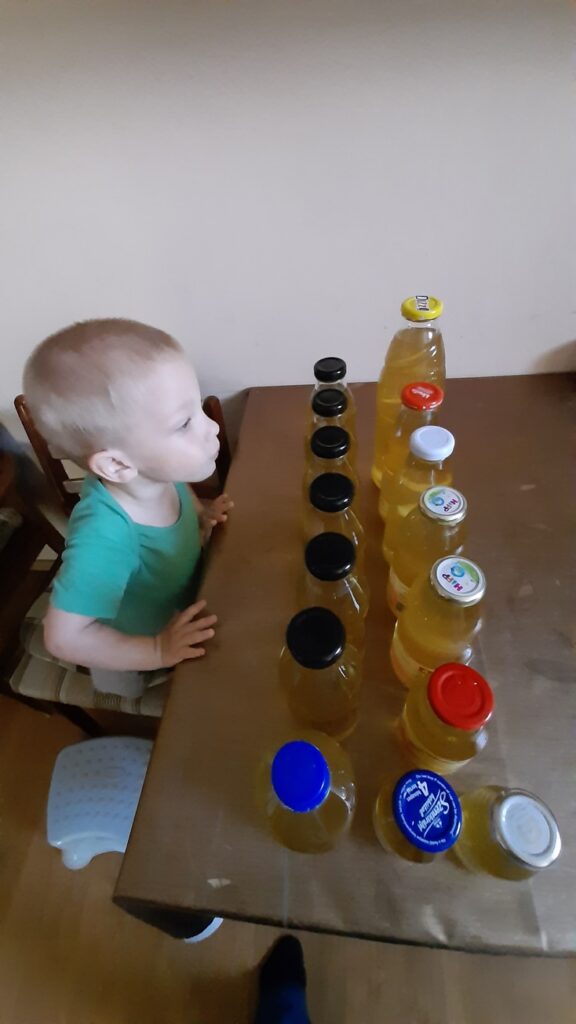 Pénteken Anyának nagy segítsége voltam. Állítólag valami szörp készítésbe voltunk benne. Nem értem nekem tetszett, hogy az üvegeket megtöltjük.
